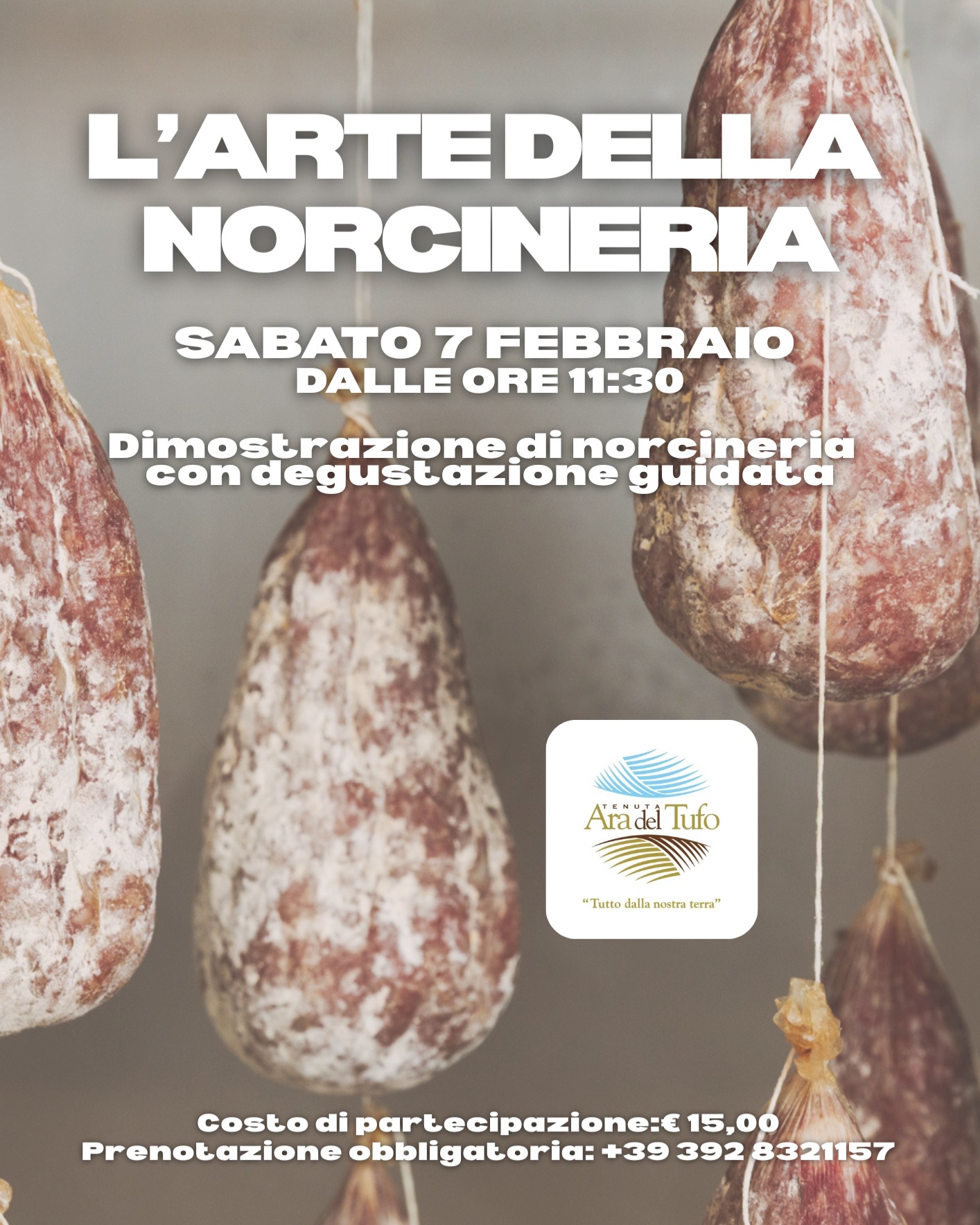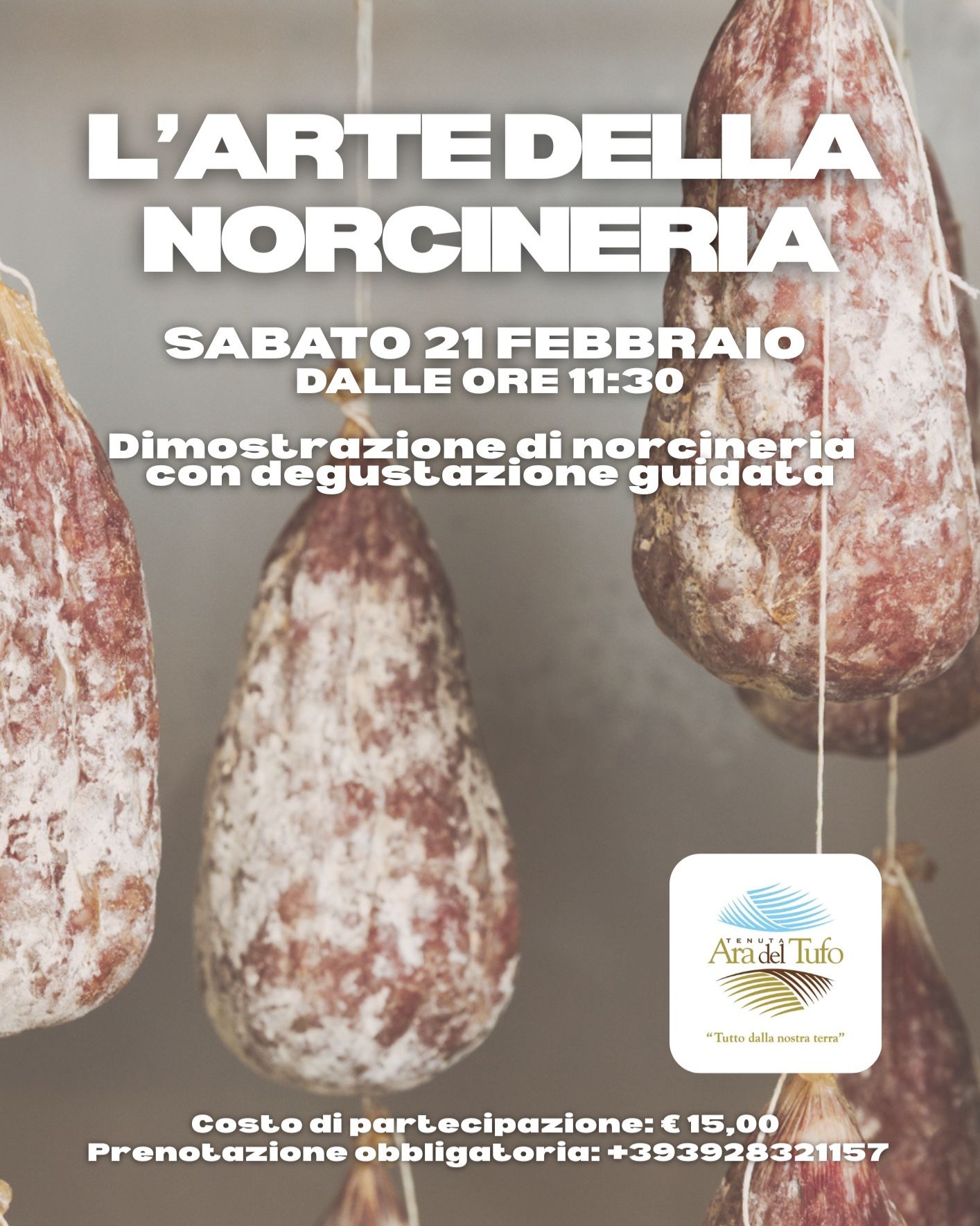 In Tenuta Ara del Tufo ti aspetta L’Arte della Norcineria: un laboratorio di lavorazione del salume in tutte le sue fasi, per scoprire da vicino gesti, tempi e tecniche della tradizione.